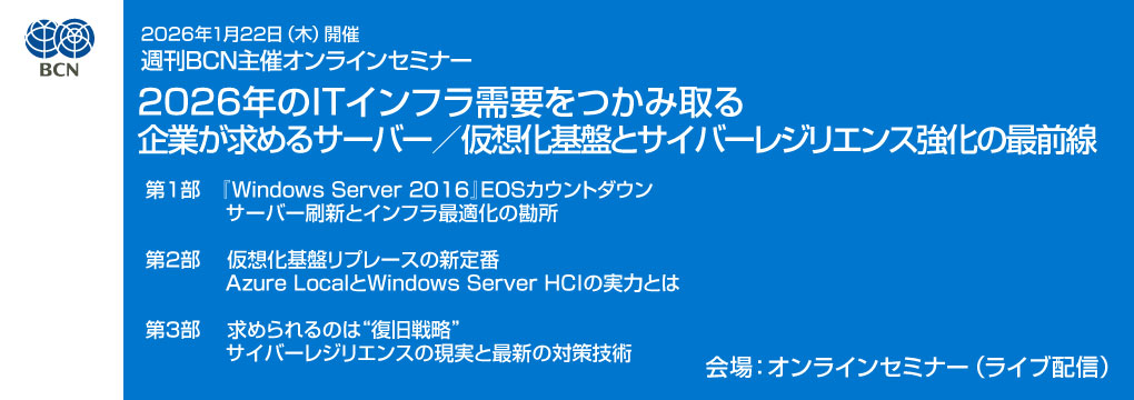 ■セミナー申し込みにおける個人情報の取得・利用・提供について 株式会社BCNは、個人情報保護に関する法令やその他の規範を順守し、下記の通り個人情報を取得し、利用・提供いたします。 1.個人情報の管理者 株式会社BCN 個人情報管理責任者 連絡先 〒101-0047 東京都千代田区内神田2-12-5 内山ビル2階 TEL:03-3254-7801 FAX:03-3254-7802 電子メール:privacy@bcn.co.jp 2.個人情報の利用目的 (1)当社主催または共催するセミナーや各種イベント、当社商品・サービスに関する情報のご提供 (2)当社商品・サービス、当社主催または共催するセミナーや各種イベント等の品質維持・改善・評価のためのアンケート (3)お問い合わせ、お申込みへの回答・ご連絡等 3.個人情報の外部委託 当セミナー運営のため、ASPサービス会社、ならびに、当社刊行物およびその他関連した商品・サービスをお届けするため発送会社に対して個人情報を提供することがあります。 この場合、秘密保持契約を締結した上で、適切な指導、管理をいたします。 4.第三者への提供について (1)本セミナーに受講申込頂いた方のご登録情報の全てを下記協賛企業へ提供いたします。 (協賛企業名:デル・テクノロジーズ株式会社) なお、開催日までに協賛企業が追加となりました場合は、セミナーWebサイトに公開しますとともに、追加となりました協賛企業ともご登録情報を共有させていただきますので、 予めご了承の上、お申込みのほどお願いいたします。 (2)情報は暗号化した電子データにて取り扱います。 (3)提供された情報は協賛企業からの商品・サービス、各種セミナー・イベントの情報提供、および営業活動に利用されます(電話、メール、または郵送にてご連絡することがあります)。 詳細は協賛企業の「個人情報保護方針(プライバシーポリシー)について」を参照ください。 デル・テクノロジーズ株式会社 https://www.dell.com/ja-jp/lp/legal/policies-privacy (4)法律等に基づき提供しなければならない場合、個人情報を提供することがあります。 5.個人情報を与えることの任意性 利用目的に必要な範囲の情報を取得しております。 これら以外の情報を与えて頂く必要はありませんが、これらの情報についてはセミナー運営をはじめ、各種サービスの提供のために必須ですので、 万一、与えて頂けない場合は、サービスを行うことができません。 6.個人情報の開示等について 個人情報の開示、訂正を希望される場合は、ご本人の確認を行ったうえで、できるだけ速やかに対応いたします。 お問い合わせや訂正につきましては、問い合わせ窓口までご連絡ください。 なお、情報の開示に当たっては、別途実費を請求させていただく場合がございます。 7.株式会社BCN 個人情報保護方針/プライバシーポリシー https://www.bcn.co.jp/about/policy/